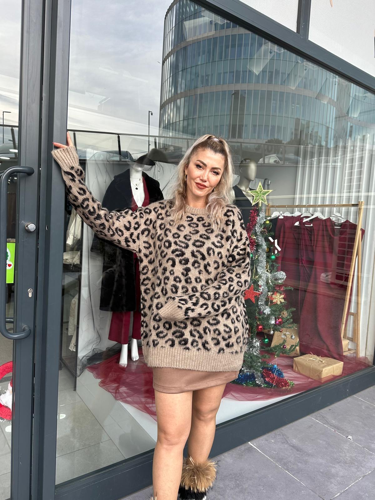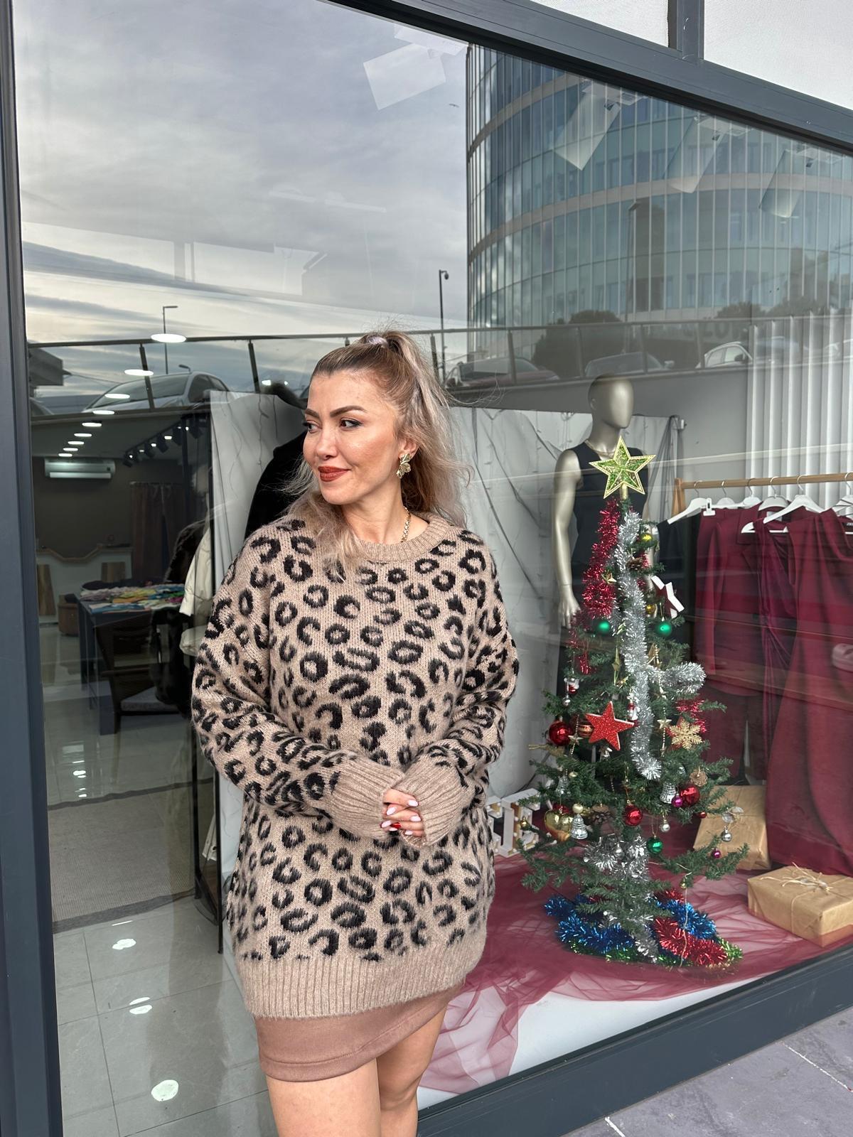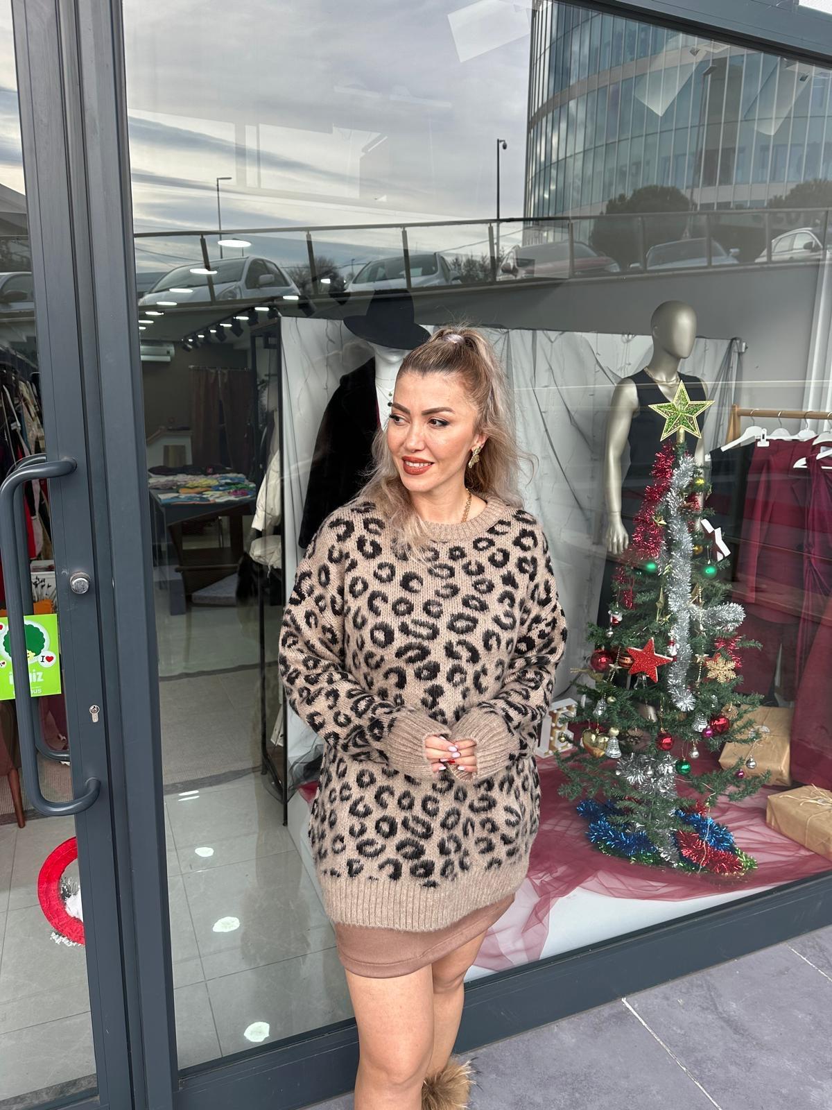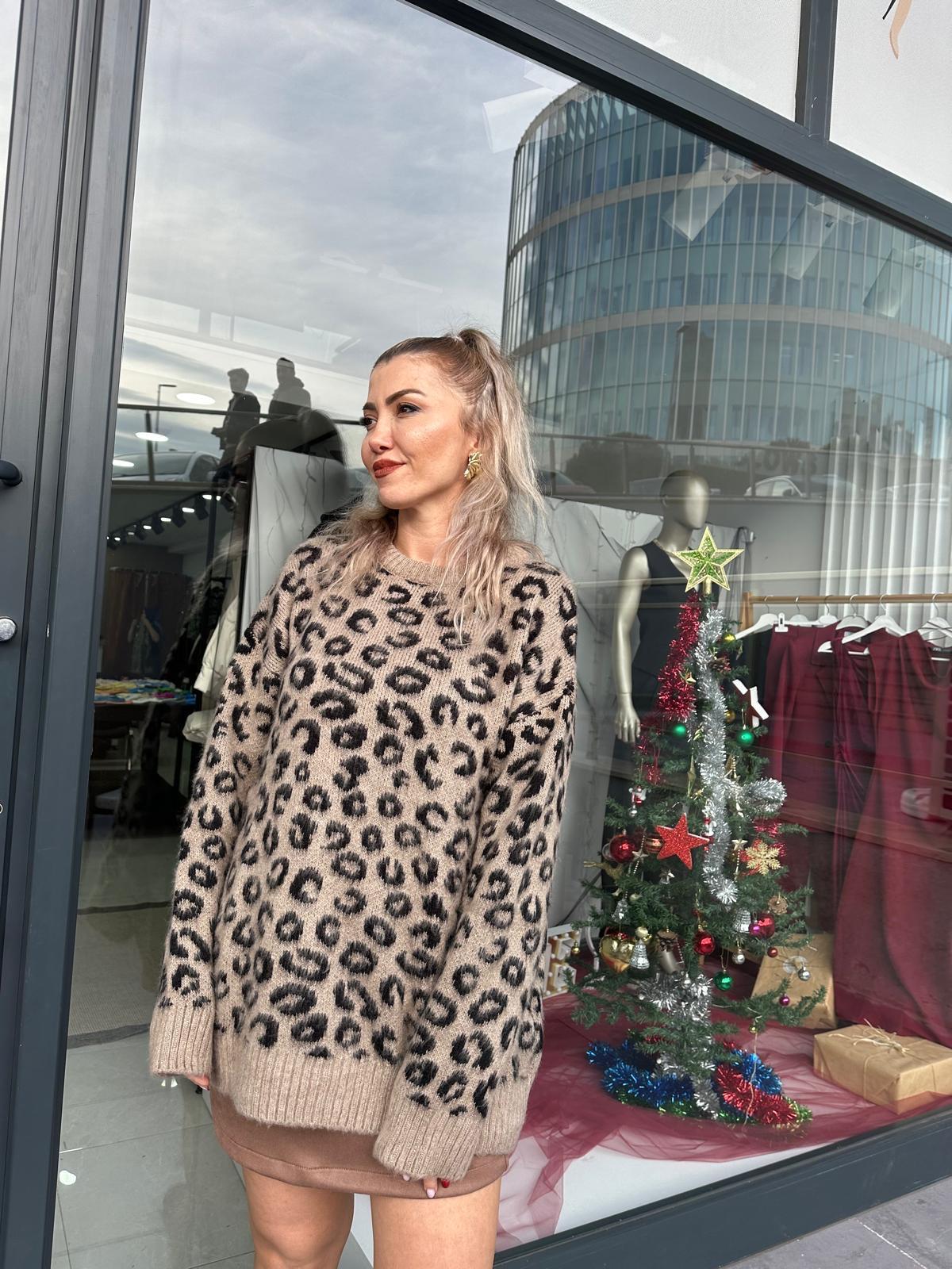 BEJ RENGİ SİYAH LEOPAR DESENLİ TRİKO KAZAK