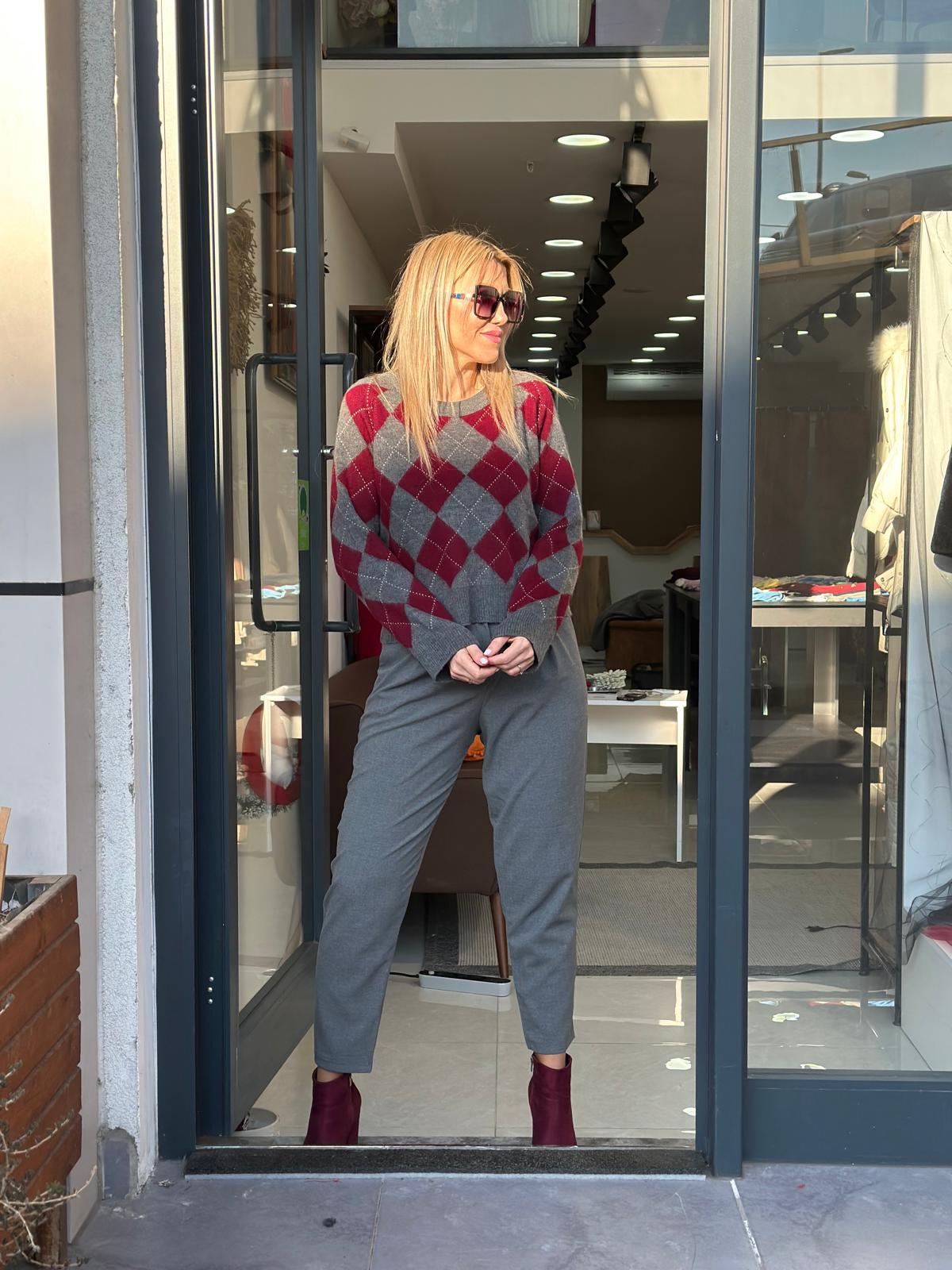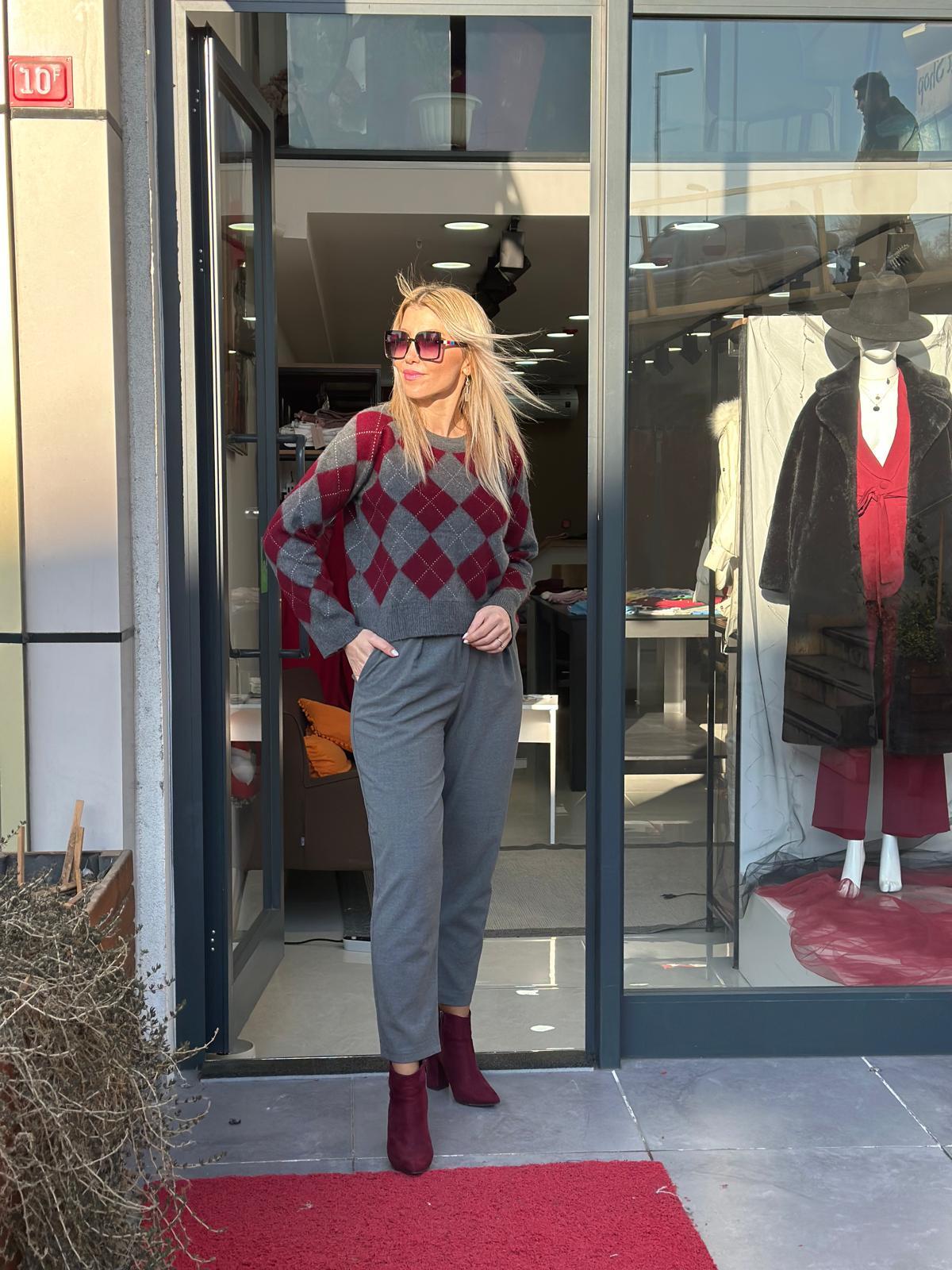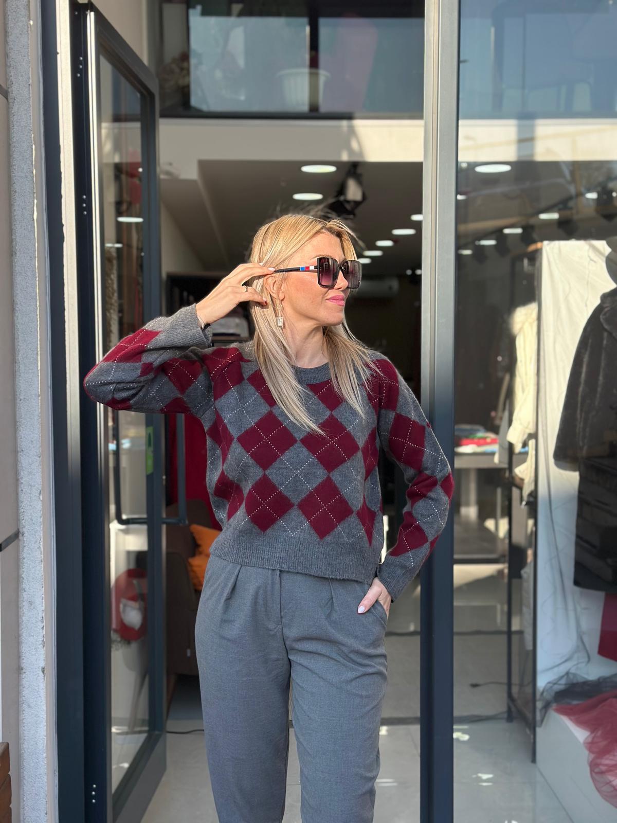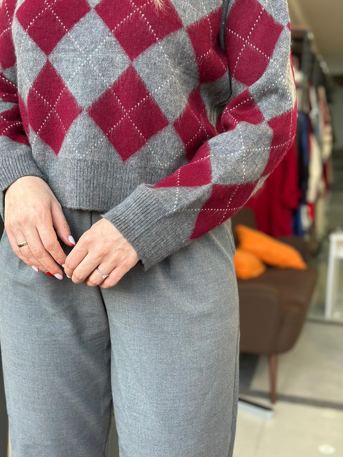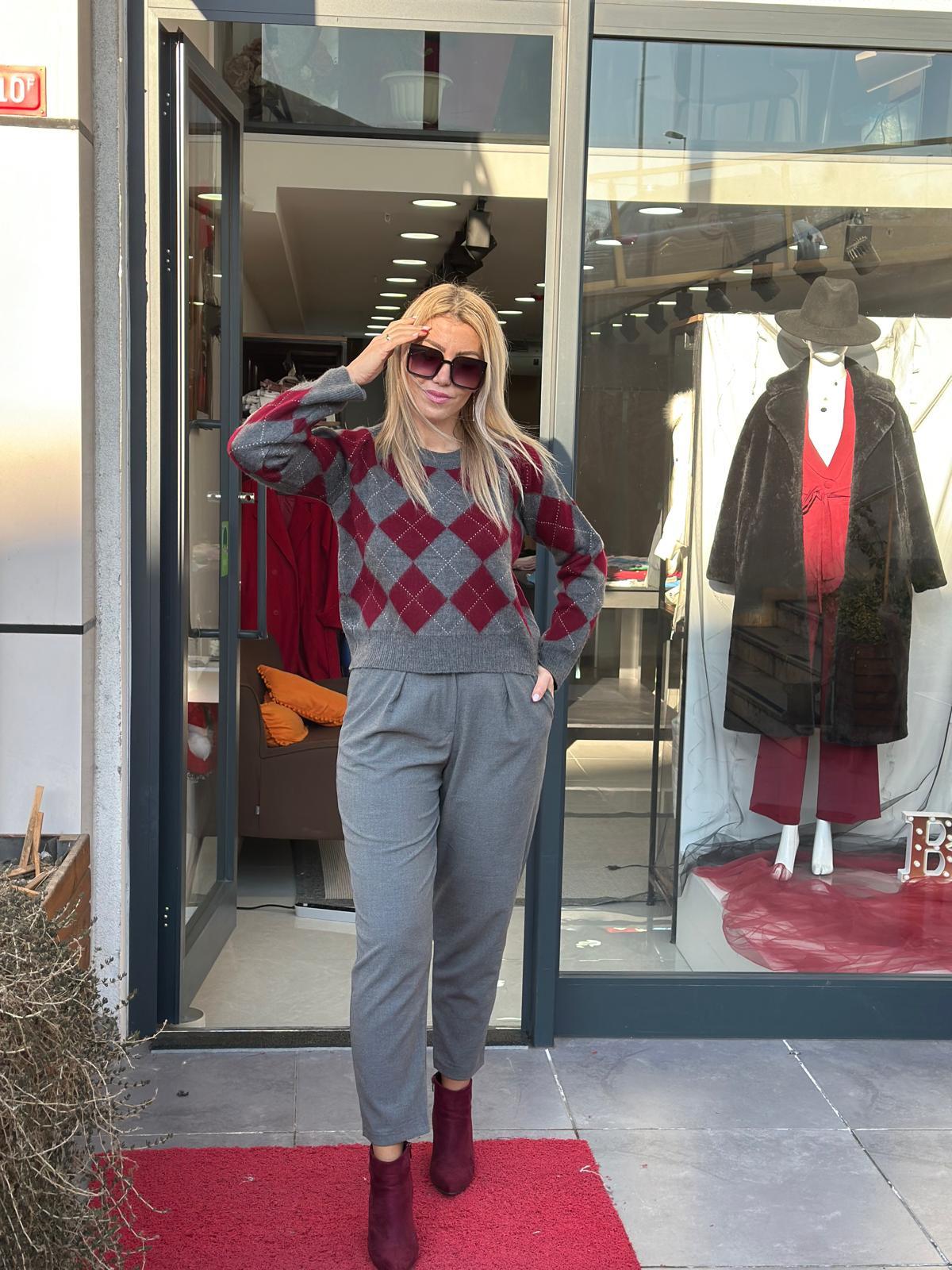 GRİ BORDO BAKLAVA DESENLİ TRİKO KAZAK