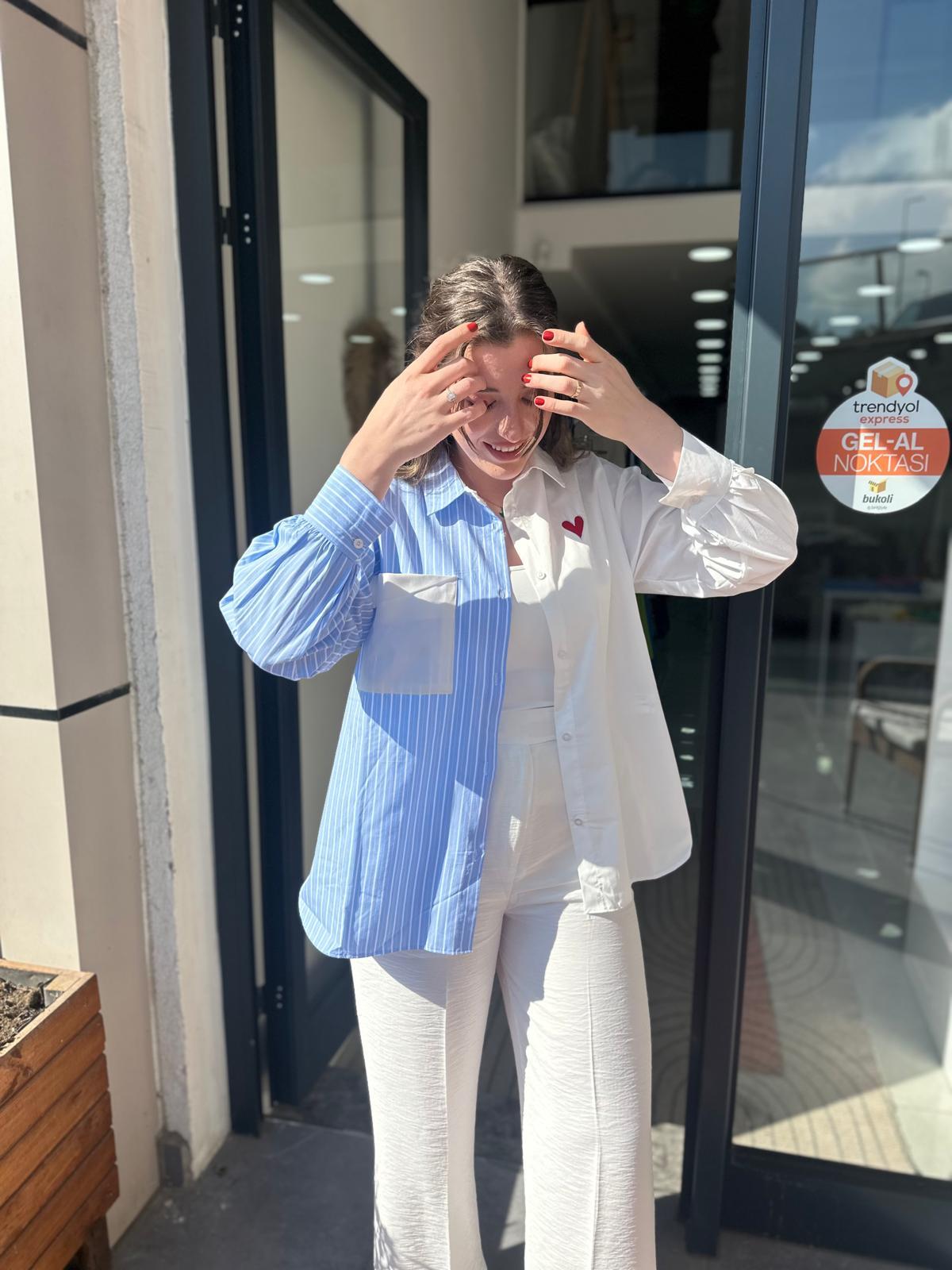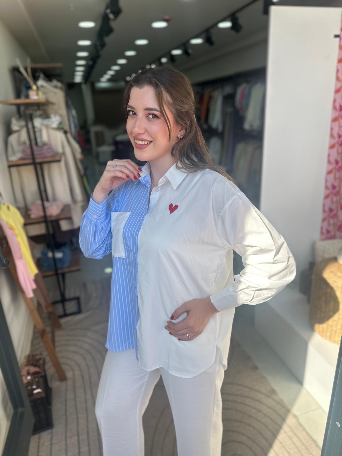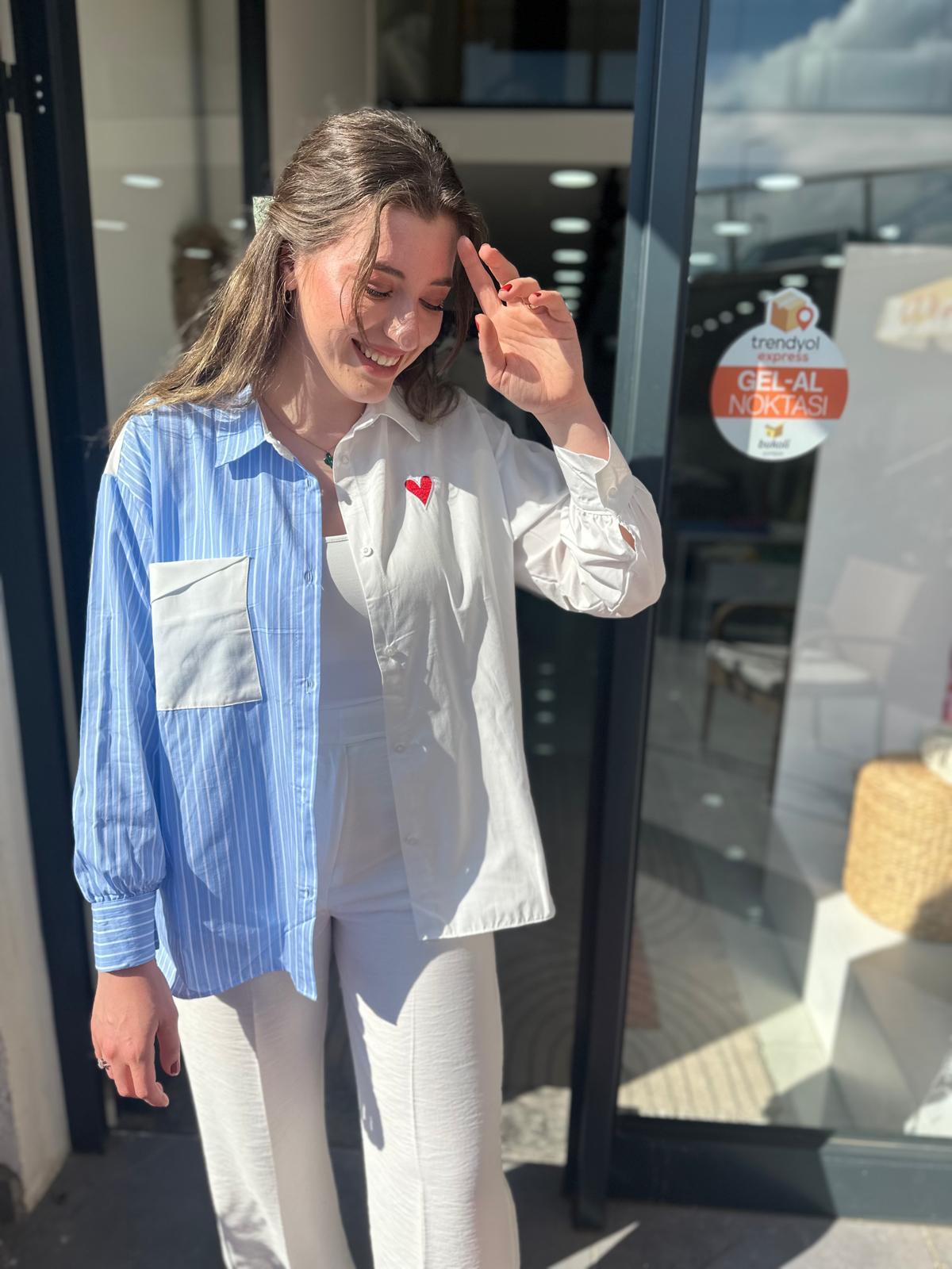 Kalp Nakışlı Mavi Gömlek