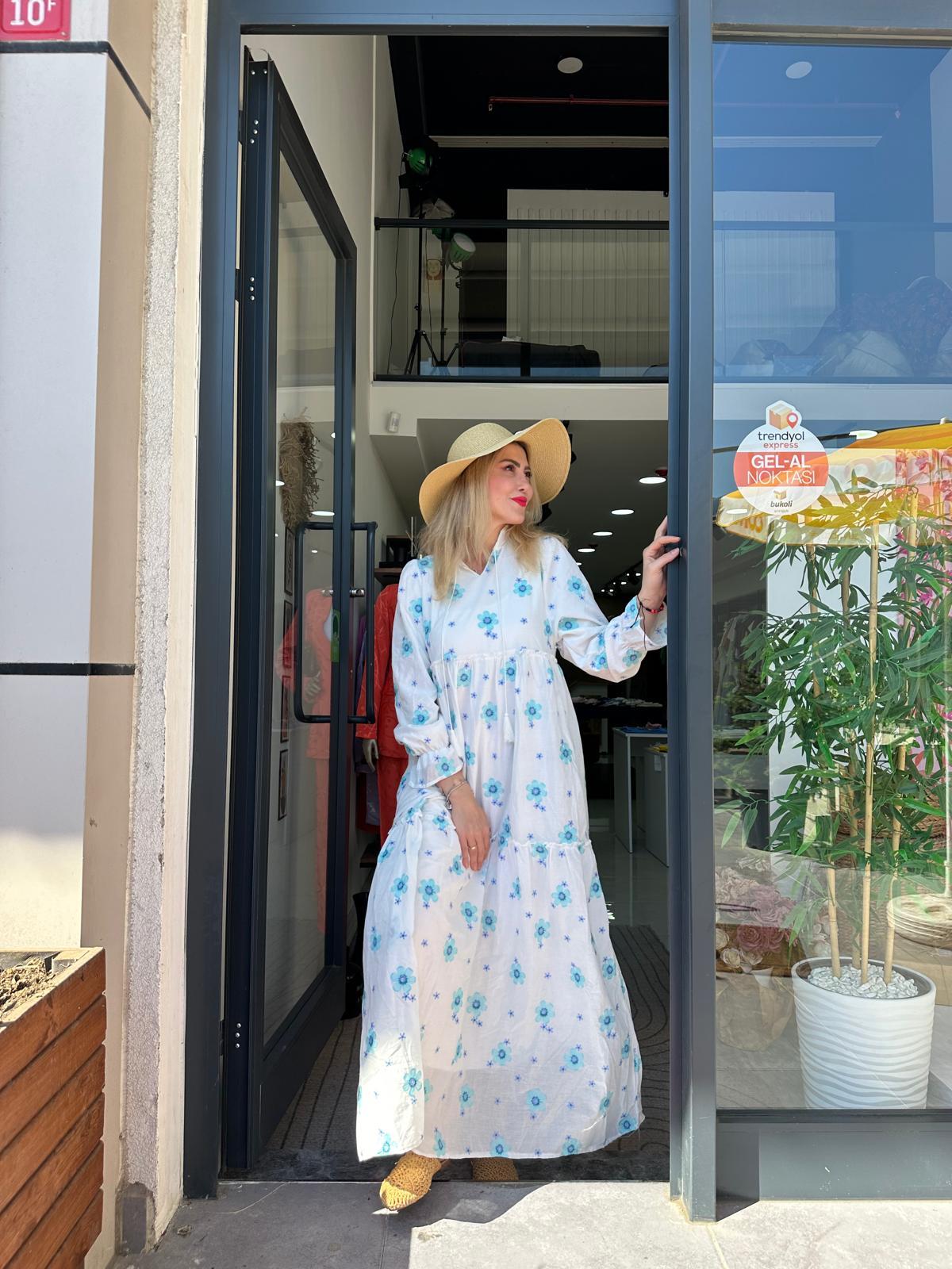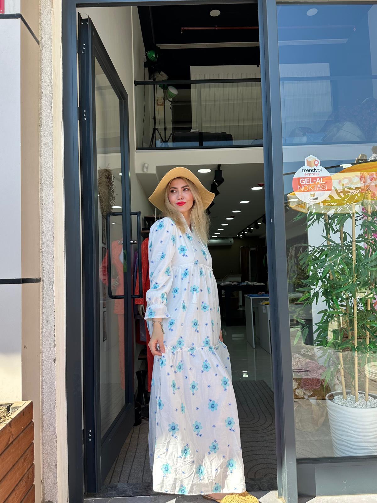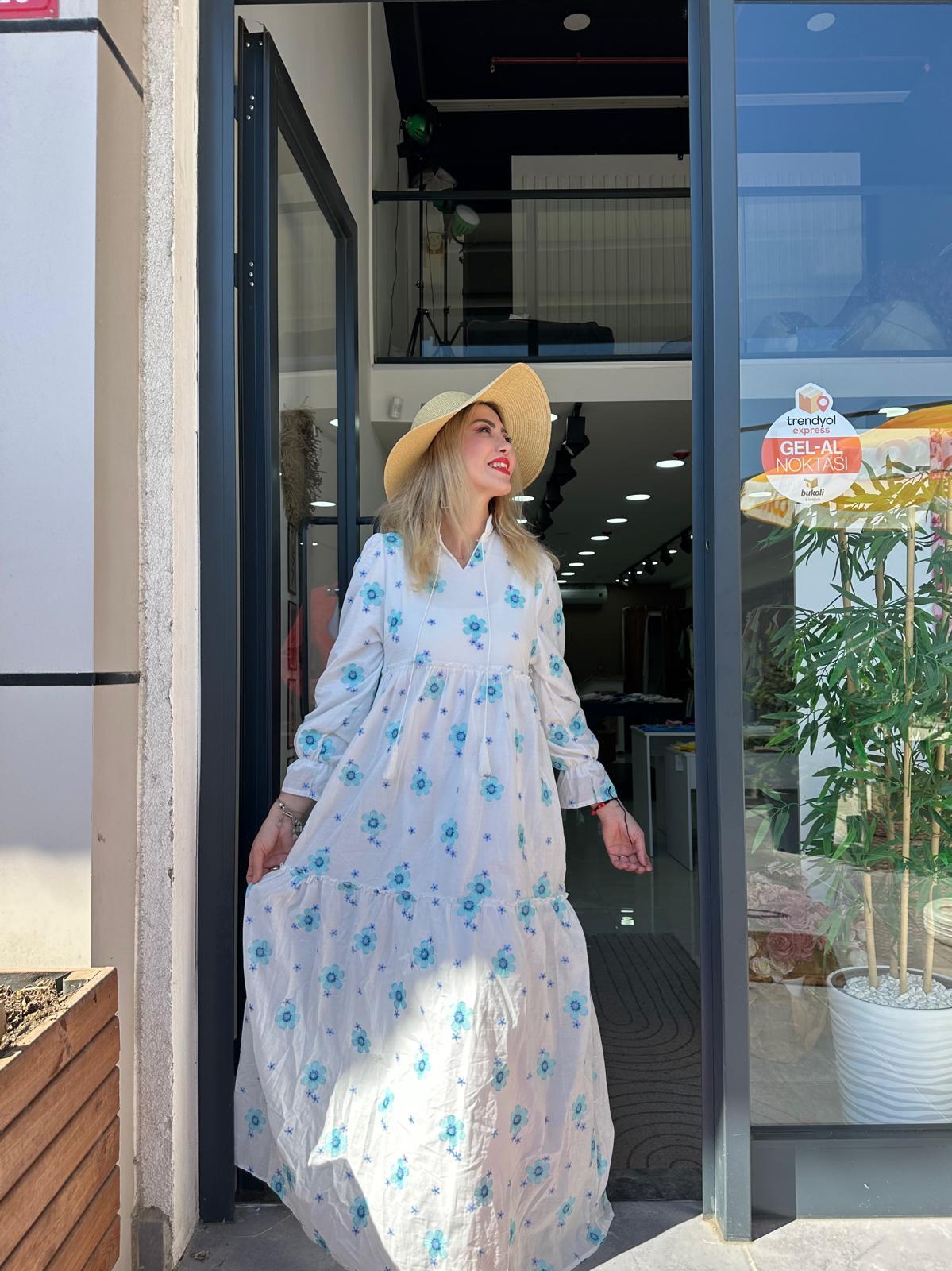 MAVİ Çiçek Nakış Detaylı Elbise