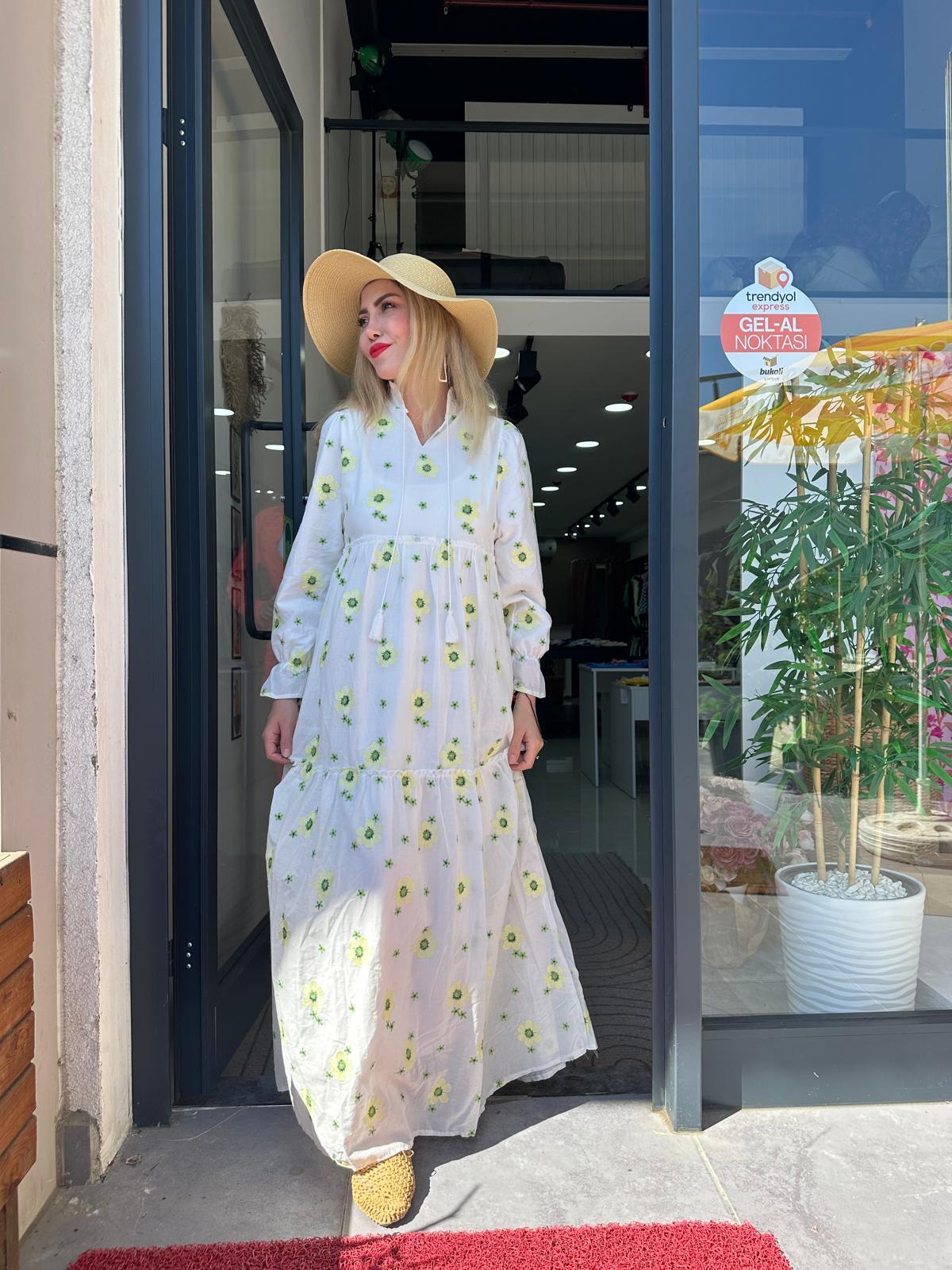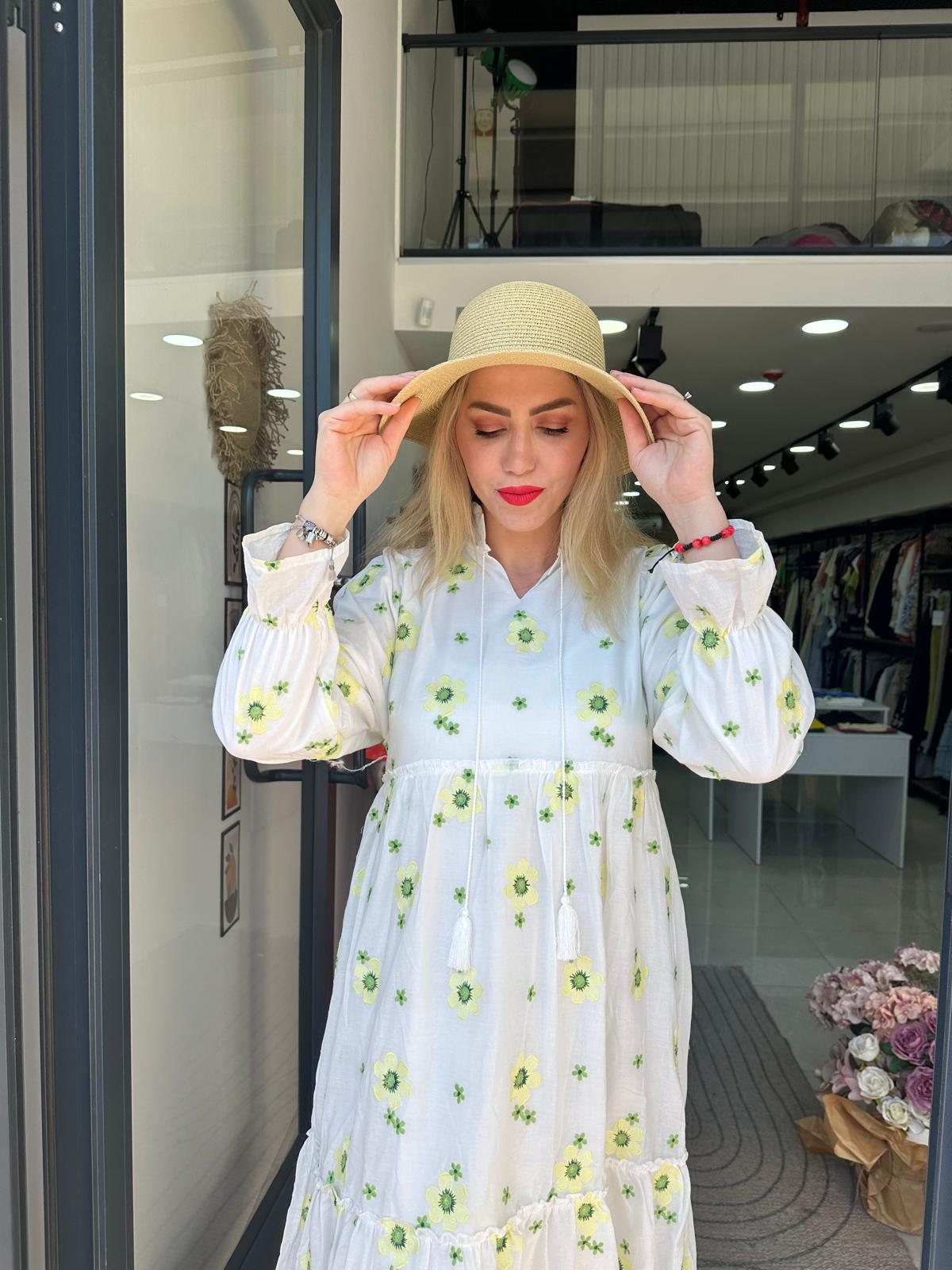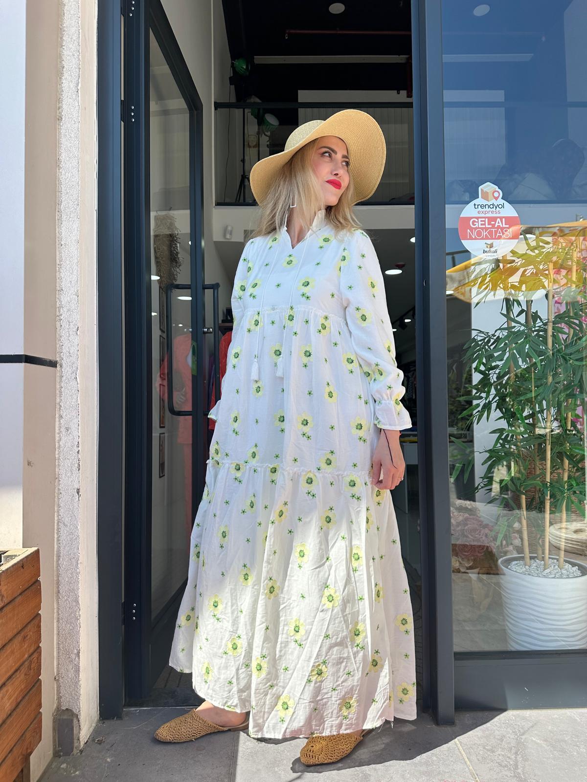 SARI CİCEKLI POPLIN ELBİSE