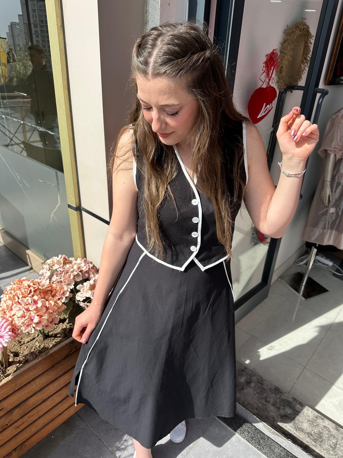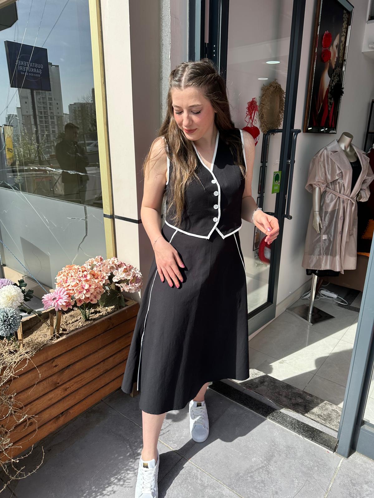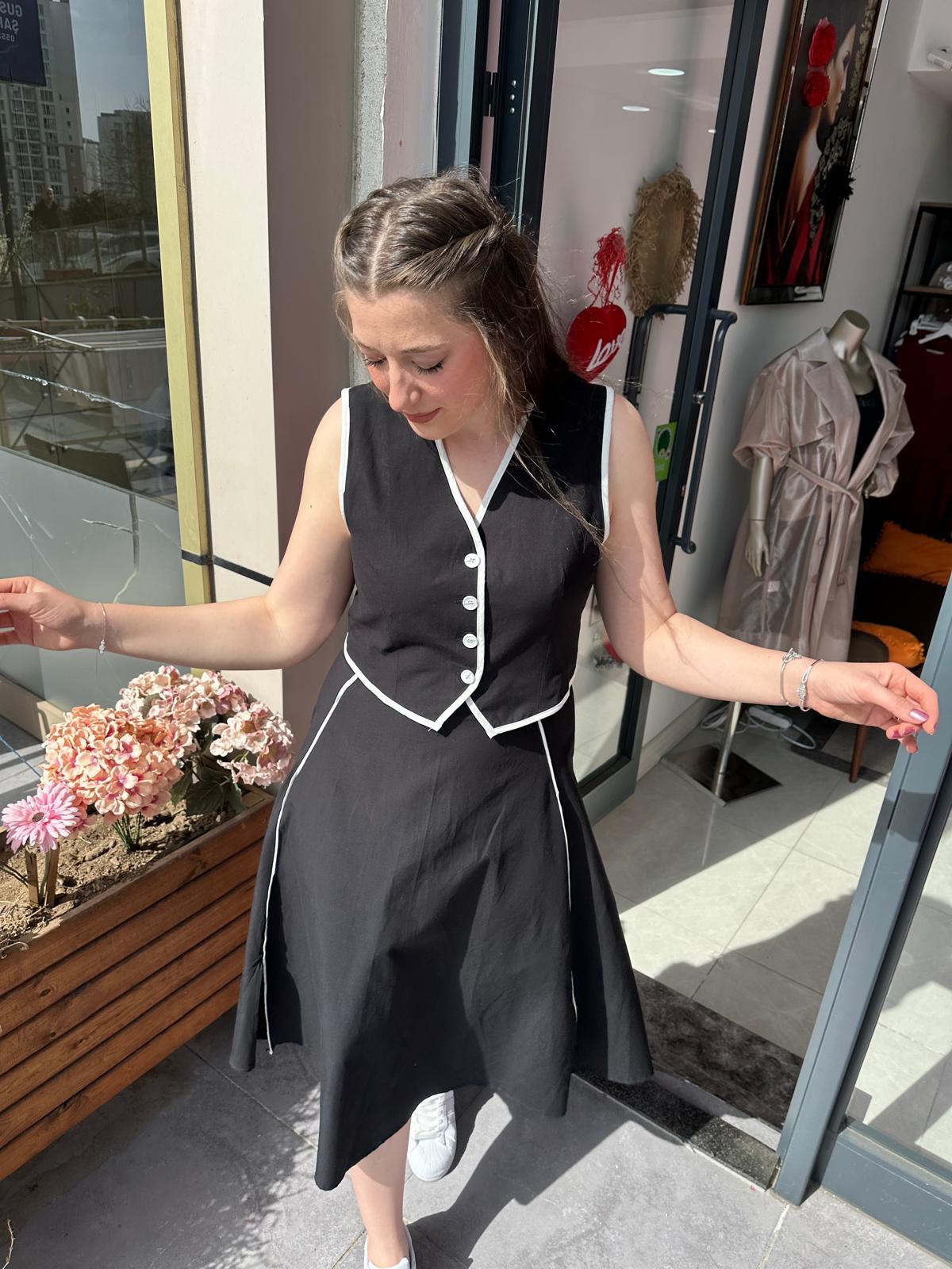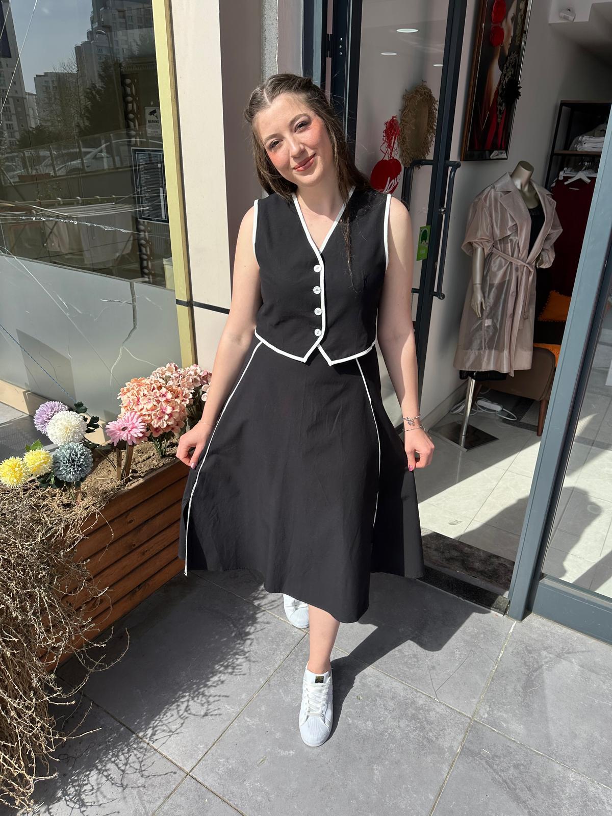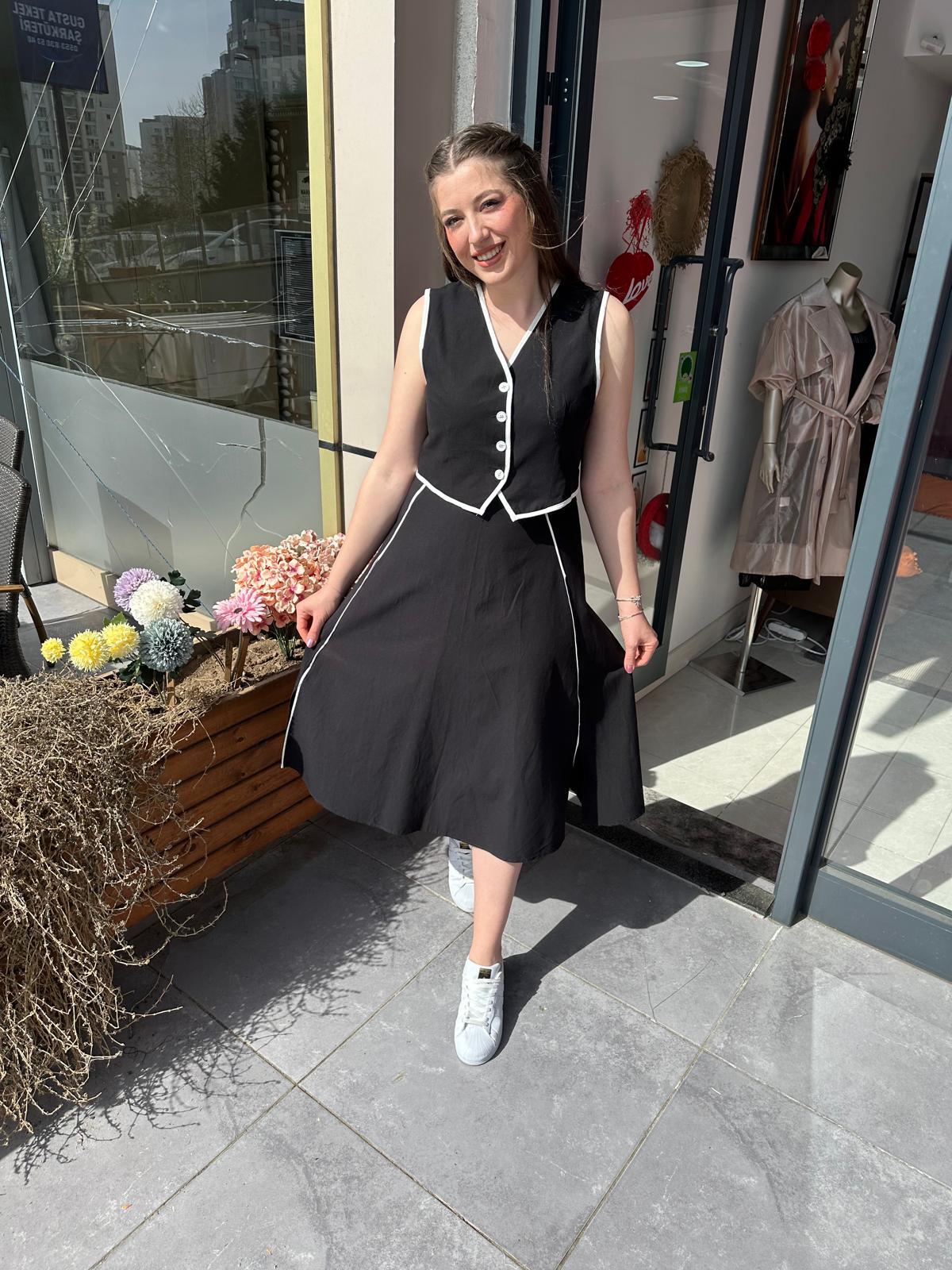 SİYAH GABARDİN KUMAŞ BEYAZ BİYE DETAYLI YELEK ETEK TAKIM